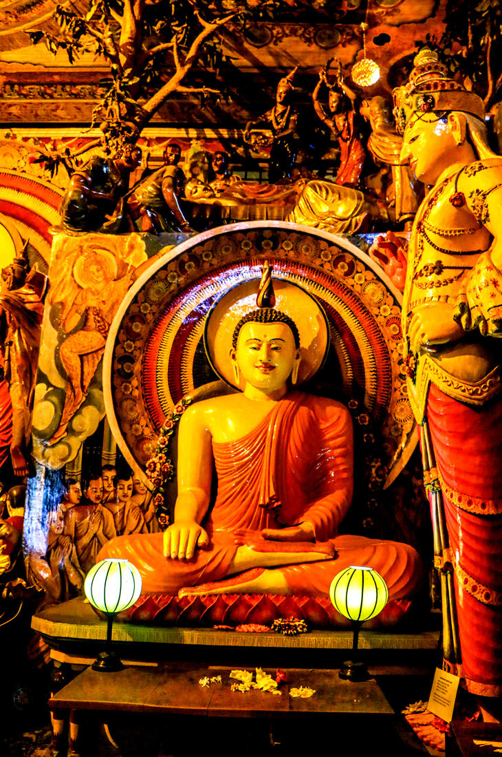 The temple’s most distinguishing feature is its treasure-trove museum that holds an innumerable number of Buddha statues from all over the world along with statues of Hindu gods, old watches, Dutch coins and many other antique collectibles. The temple museum proudly houses the smallest Buddha statue on the island, carefully encased in a glass box, which visitors can view with a magnifying glass. Most of the bejeweled and shiny trinkets here are gifts from devotees to the temple’s head monk, Ven. Galaboda Gnanissara Thero, one of the island’s most recognizable religious figures, who assumed administration of the Gangarama as a 16-year-old novice monk. An ardent traveler, the temple is overrun by outlandish souvenirs Gnanissara Thero has gathered from places he’s been to, such as a “hip” Buddha statuette sporting a pair of sunglasses. The venerable monk is also an antique car lover and visitors can marvel at his collection of old Rolls-Royces and Mercedes, including Sri Lanka’s very first Mercedes.